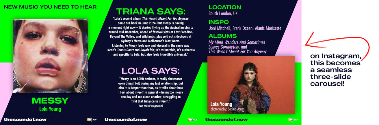 Uses promotional photgraphy of Lola Young by Sophie Jones and typefaces MADE Outer Sans and ZT Talk.