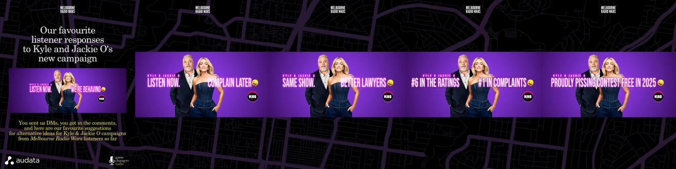 When it was revealed Kyle and Jackie O's tagline on billboards in 2025 was Listen Now, We're Behaving, the Melbourne Radio Wars team invited listeners to submit their own ideas for alternative billboard designs. I then edited them to look like the real billboards.